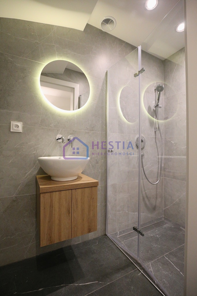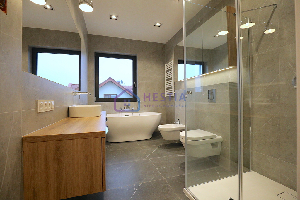 -przestronna , nowoczesna łazienka z oknem i centralnie usytuowaną z wanną wolnostojącą, kabiną prysznicową, podwieszanym wc i bidetem, duża szafka pod umywalkowa.
