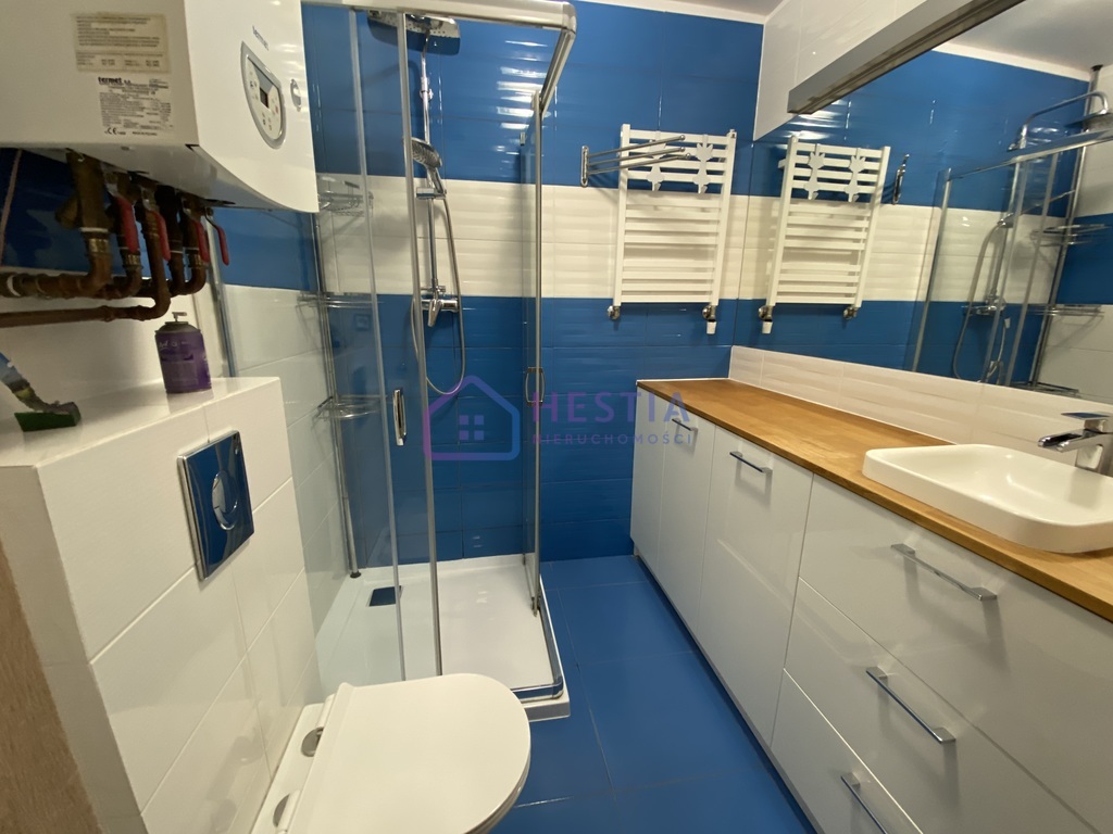 - łazienka z kabiną prysznicową, licznymi szafkami oraz toaletą,