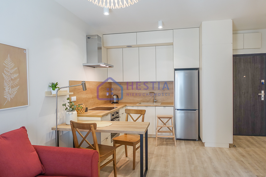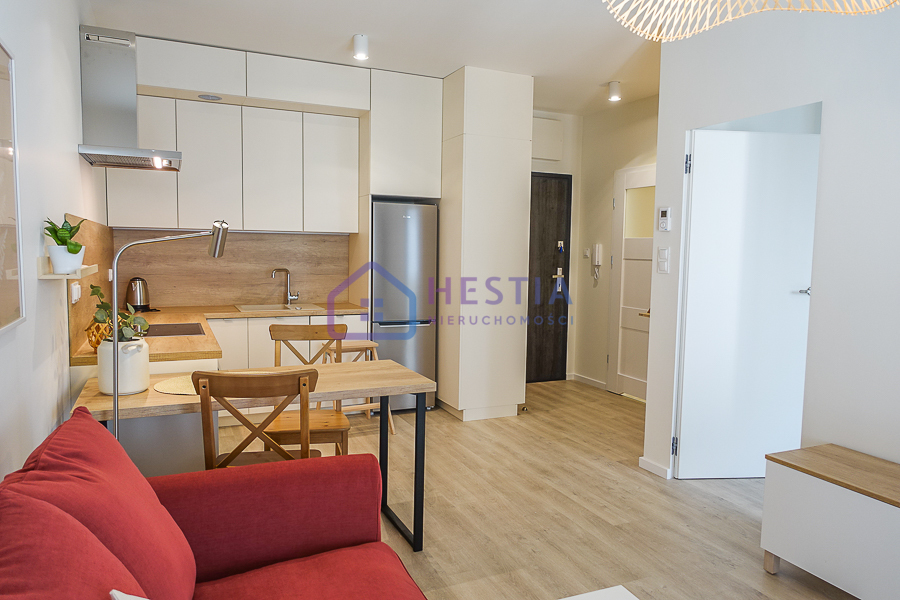 Aneks kuchenny w pełnym wyposażeniem: lodówka z zamrażarką, okap, płyta ceramiczna, piekarnik, zmywarka. W pokoju wąski stół, ława na kółkach, stolik RTV, kanapa rozkładana, w sypialni szafa dwudrzwiowa, łóżko dwuosobowe 1,40 m szerokości, komoda z szufladami, stoliczki, półka, w przedpokoju szafa dwudrzwiowa, półka, lustro. W łazience pralka, umywalka, szafka, kabina prysznicowa bez brodzika, płytki ceramiczne. Wszystkie sprzęty na gwarancji. W oknach rolety. Możliwość podłączenia telewizji kablowej i internetu. Koszt 2600 zł, dodatkowo czynsz do zarządcy, energia elektryczna, woda, ogrzewanie z SEC-u. Ogrzewanie i podgrzanie wody miejskie. Łączna kwota opłat dodatkowych to ok. 420 zł płatne miesięcznie ryczałtem i rozliczane co 6 miesięcy. Kaucja 5200 zł. Oferta dla pary lub singla. Mieszkanie nie jest przystosowane dla dzieci ani nie mogą być zwierzęta. Najem okazjonalny ze wskazaniem przez osobe trzecią mieszkania do którego wyprowadzi się najemca po zakończeniu najmu lub umowa na firmę.