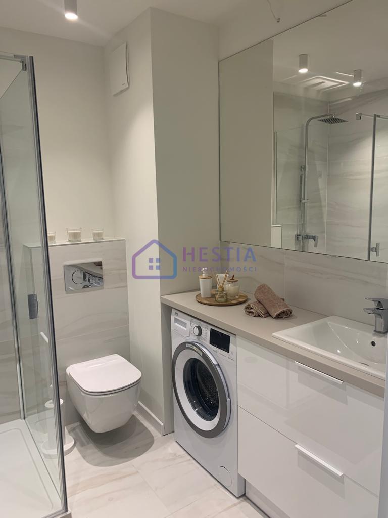 * łazienka z kabiną prysznicową i wc, dodatkowo pralka, duża ilość miejsca do przechowywania;